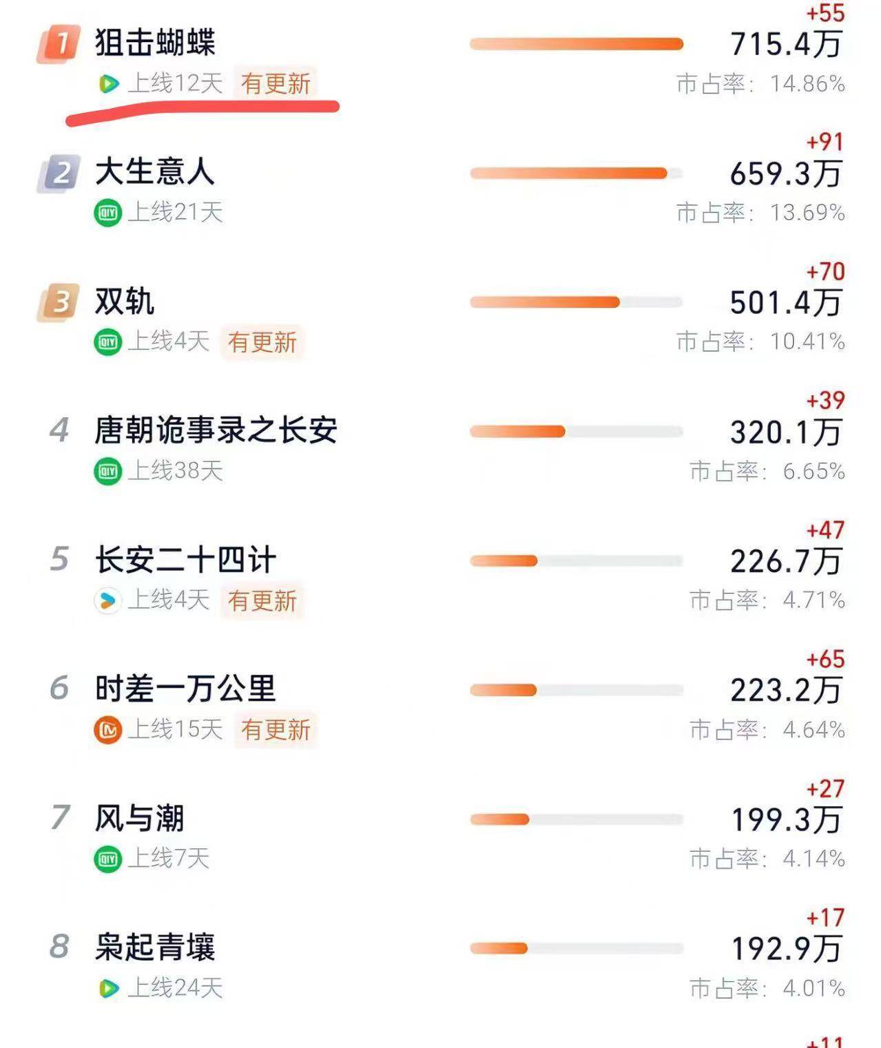 而《狙击蝴蝶》自开播以来,收视率也确实一路飙升,直冲电视剧排行榜第一。
